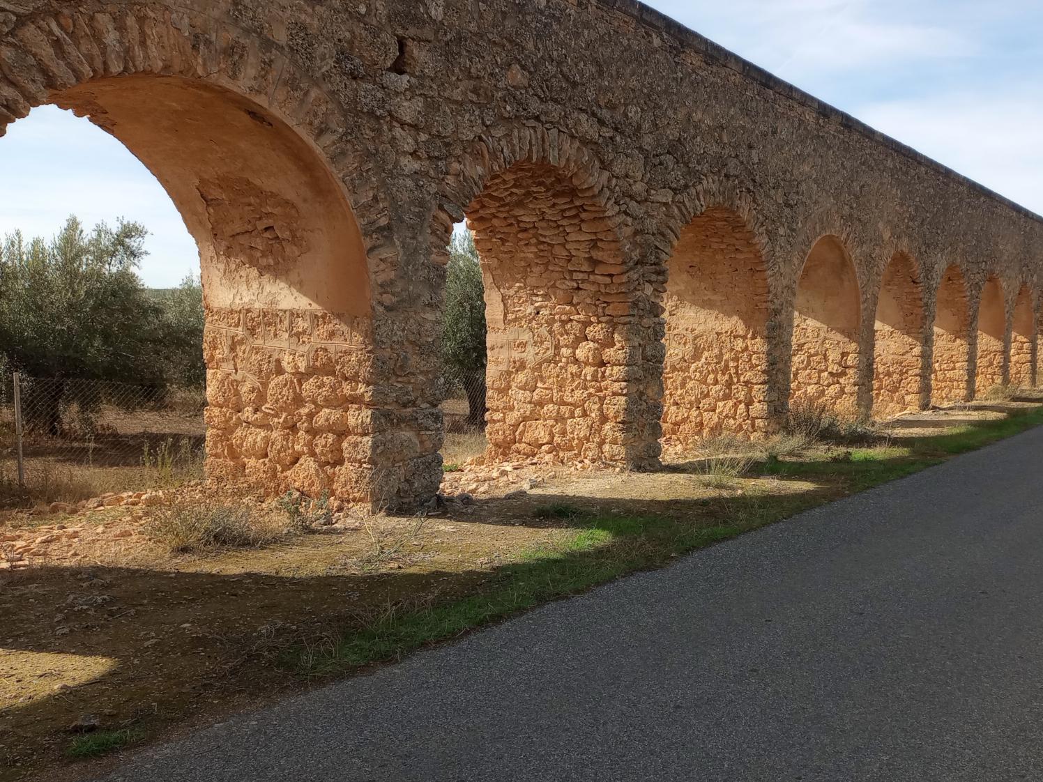 Es un acueducto de 78 arcos de medio punto de una planta, de mampostería, sistema tradicional de construcción que consiste en erigir muros y paramentos mediante la colocación manual de los elementos o los materiales que los componen. El acueducto fue construido con piedra de la zona -turronera- y argamasa (tipo de mortero empleado en la construcción, compuesto por cal, arena y agua) de la región durante la primera mitad del siglo XX.
