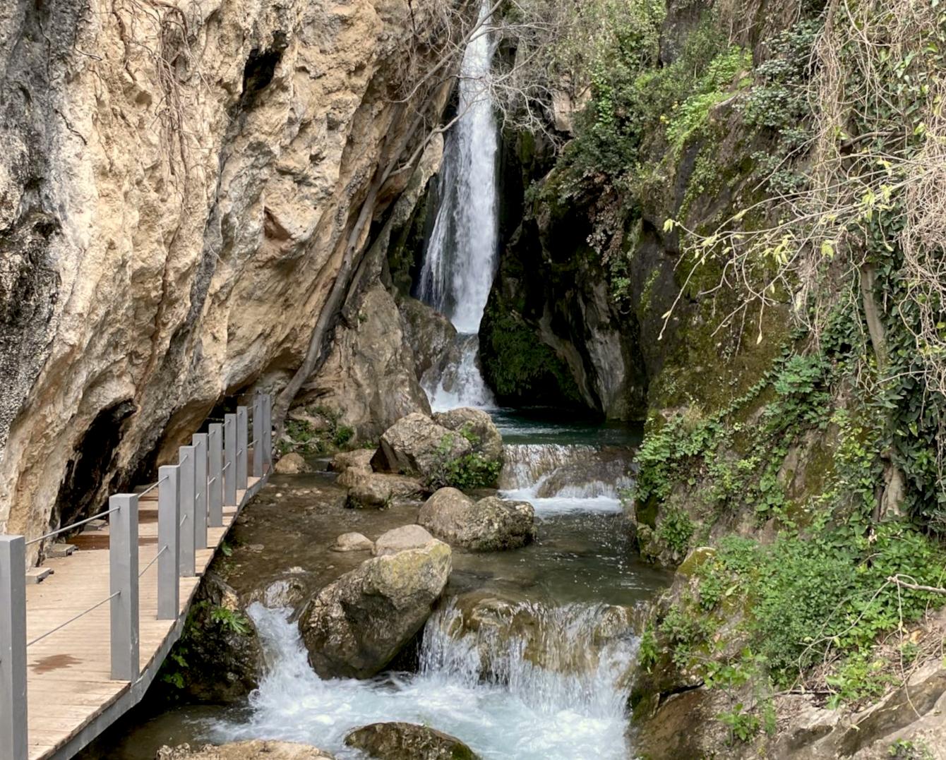 Desde aquí bajamos por unas escaleras hasta llegar a la cueva, o yo la llamaría semicueva ya que está abierta y no es cerrada. Dependiendo de la época del año habrá más o menos agua, brotando de cascadas que realizan su paso a través de las rocas.