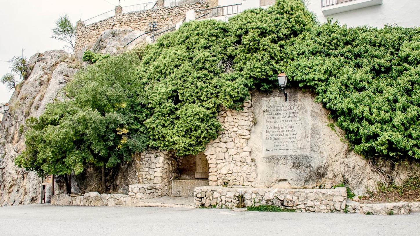 Nada más llegar al núcleo de la villa, se puede apreciar las vistas hacia todo el valle de Don Pedro y Belerda, y adentrarnos en la plaza donde se sitúa el Santuario, a los pies del Castillo. En la misma plaza que da acceso al Santuario, frente a éste, se encuentra una fuente de piedra con agua natural, sobre la que se puede leer un poema de Antonio Machado dedicado a Tíscar. Sí, Antonio Machado was here.